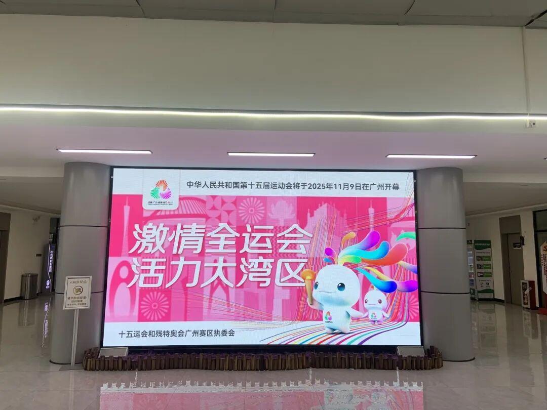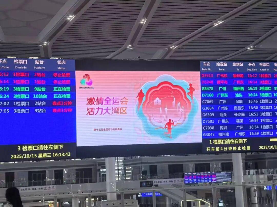 作为增城重要的交通枢纽,广州新塘站内,时刻表大屏也以十五运海报传递全运热情。