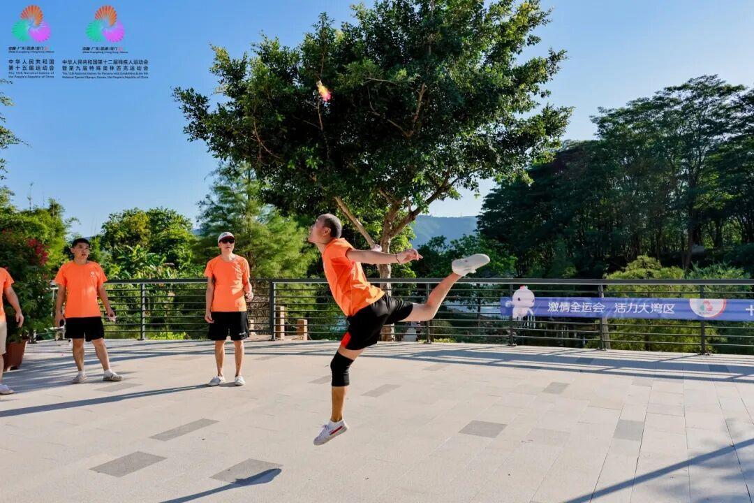 另一边,市民游客在群众体育互动区参与毽球、健身气功等群众体育项目,在风景中运动,在运动中观景。